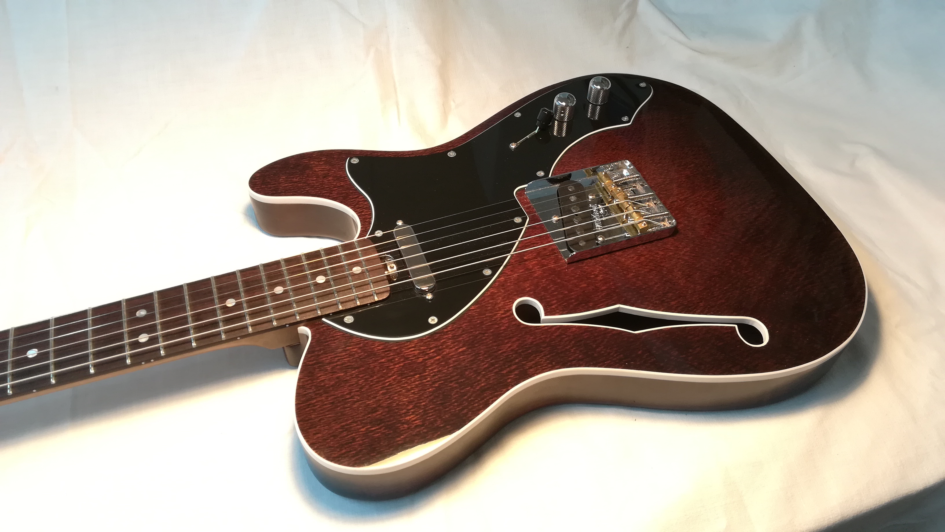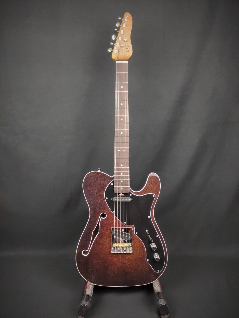 Nella liuteria elettrica apprezzo molto la semplicità per questo uno dei modelli prediletti è una riproduzione della Telecaster Thinline. Il body ha delle camere tonali laterali che lasciano spazio ad una parte centrale solida. Si possono montare pickups su richiesta del cliente così come tutto l’hardware ed i legni utilizzati.